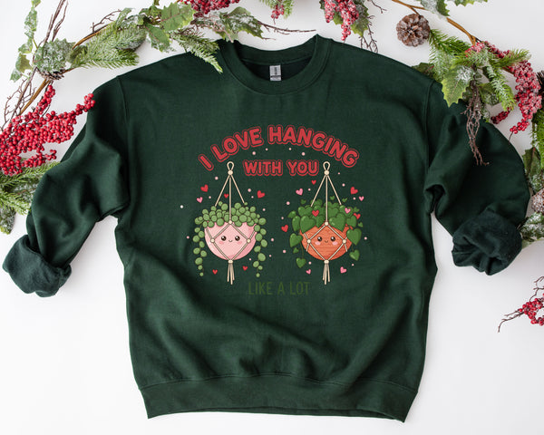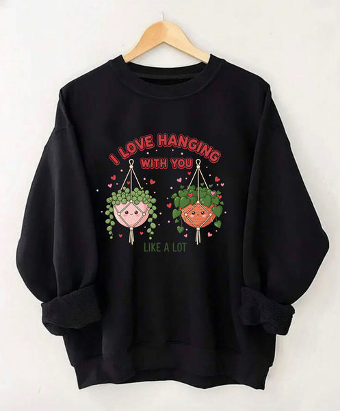 Looking for a cute and funny Valentine’s Day gift for a plant lover? This cozy black sweatshirt features adorable hanging plants and the playful phrase “I Love Hanging With You” — a sweet plant pun that’s perfect for Valentine’s Day 🌿💕