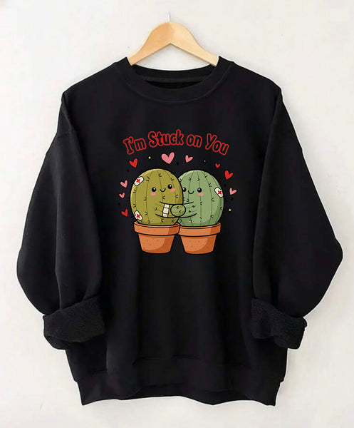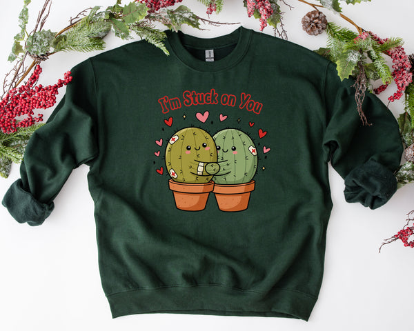 Looking for a cute and funny Valentine’s Day gift for a plant lover? This cozy green sweatshirt features two adorable hugging cacti with the phrase “I’m Stuck on You” — the perfect plant pun for love that sticks 🌵💘