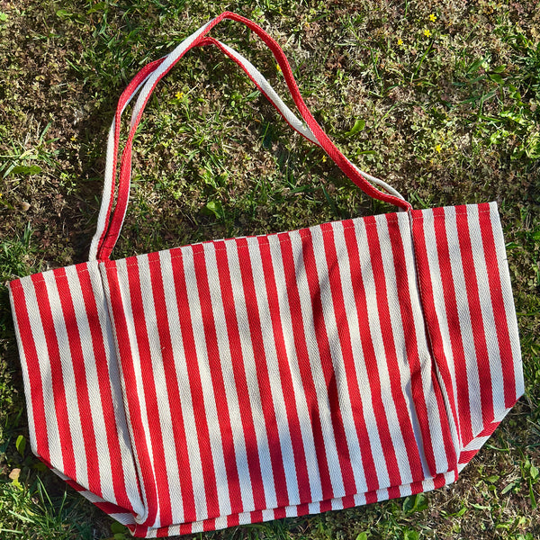Upgrade your everyday look with this beautiful red and cream striped tote bag, designed for comfort, style, and functionality. Made from a durable woven fabric, this large carryall is perfect for beach days, weekend trips, market shopping, or everyday use.