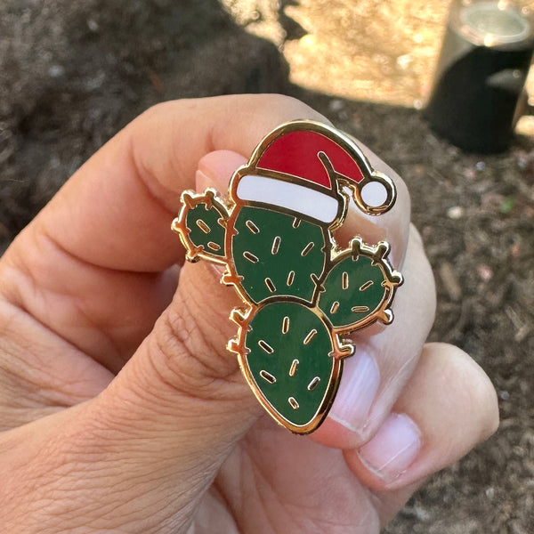 Perfect for plant lovers and holiday enthusiasts, this festive pin features a prickly pear cactus wearing a classic red Santa hat.