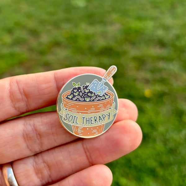 This Soil Therapy enamel pin is a little reminder that tending plants is good for the soul. Featuring a cozy terracotta pot filled with rich soil, tiny sprouts, and a garden trowel, this pin is perfect for gardeners, plant parents, and anyone who finds peace in the garden.